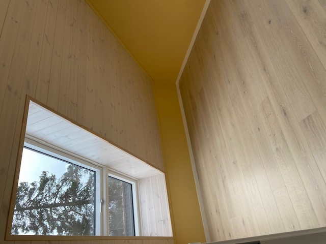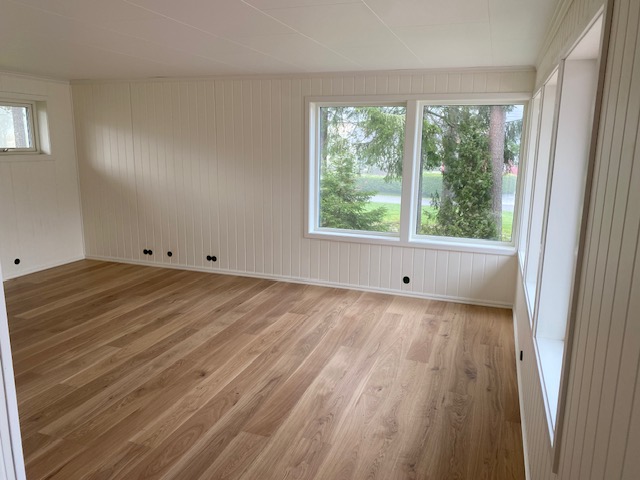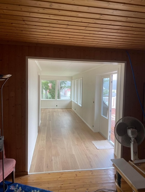Tilbygg i 2 etasjer. Fiskebensparkett i stue og tilbygg.