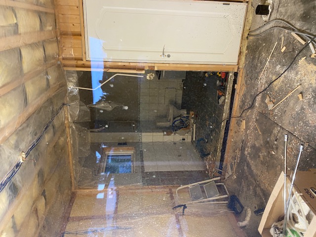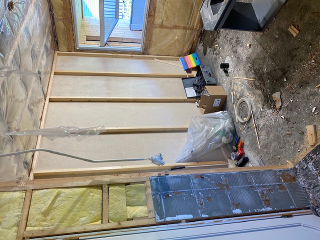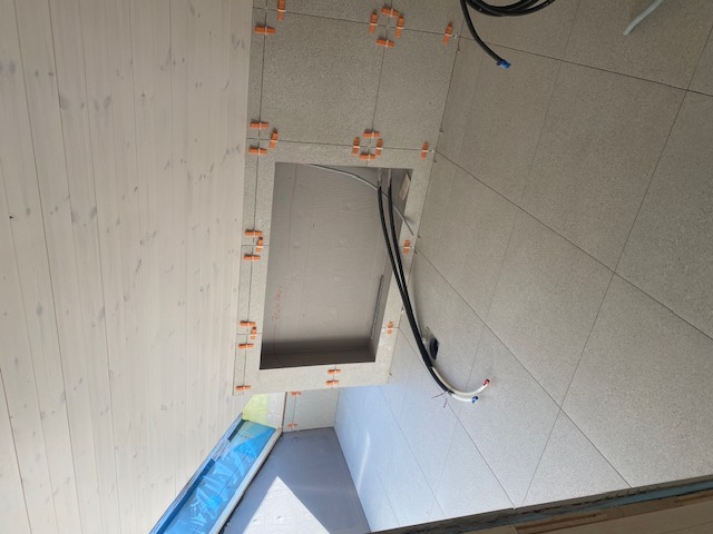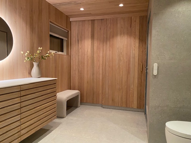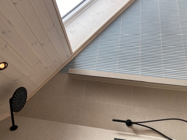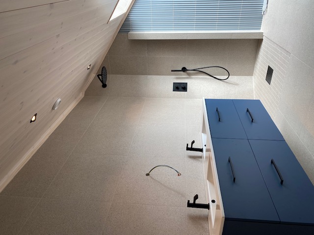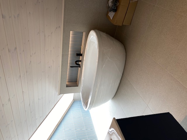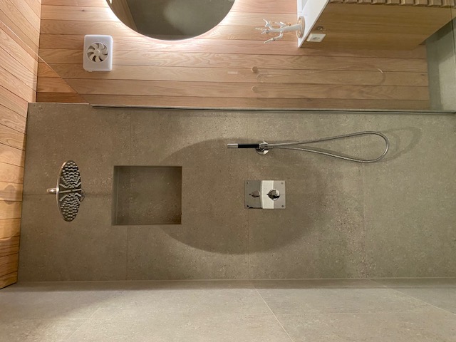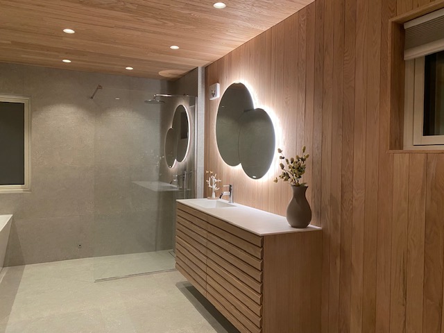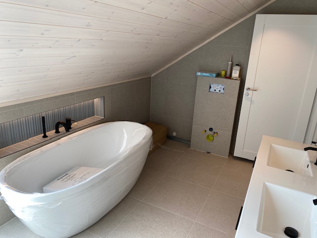 Totalrenovering av bad. Blandet fliser og panel av eik.